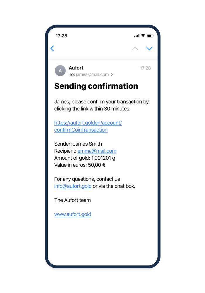 Die Zukunft ist da! Mit dem Goldkonto von Aufort können Sie sofort Gold senden oder verschenken, wo und wann immer Sie möchten. Es ist so einfach wie das Versenden einer E-Mail.